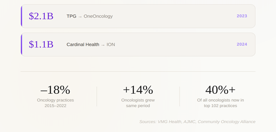 - VMG Health; AJMC. Strategic consolidation in oncology, 2024–2025.