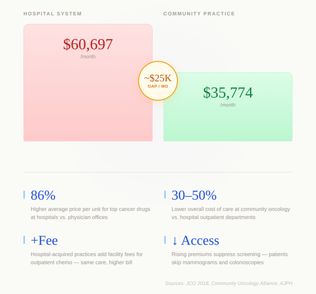 The mechanism is structural. When community practices are acquired by hospitals, the new owners bill facility fees for outpatient chemotherapy, adding costs that independent practices simply do not charge. The care stays the same. The bill changes.